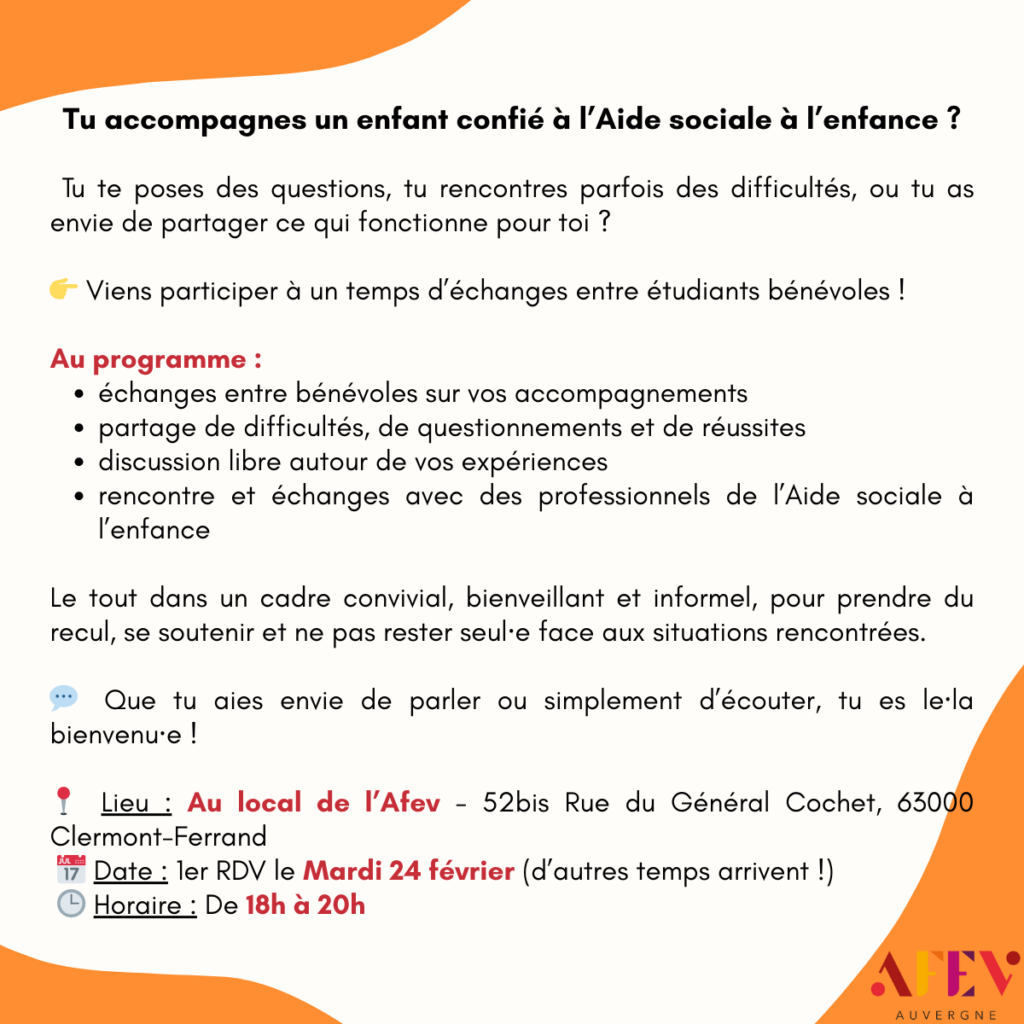 Afev Auvergne > Espace Bénévole > Formations Les formations Afin de mettre à disposition des outils, ressources et méthodes, l’Afev Auvergne te propose un catalogue de formations gratuites et facultatives. Elles sont dispensées par des intervenants professionnels. Pour t’inscrire à une formation, remplis le formulaire, et pense bien à nous prévenir à l’avance en cas de désistement ! Nom Prénom E-mail Téléphone Echange de pratiques n°1 Mardi 24 février à 18h - Local de l'Afev Auvergne Envoyer Programme 2025-2026 Nom Prénom E-mail Téléphone Psychologie de l'échec scolaire Mardi 03 Février Envoyer Nom Prénom E-mail Téléphone Enfants à besoins particuliers Mardi 03 Mars Envoyer Elles sont passées ! Les formations de l'année 25/26